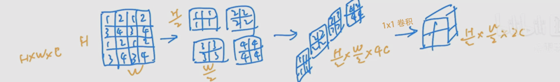 8x, 16x, 32x:Patch Merging。先像素重组:每2x2个相邻的特征点作为一组,取每组相同位置的点构成特征图,这4张特征图在通道维度上叠起来。再用1x1卷积将通道数减半。